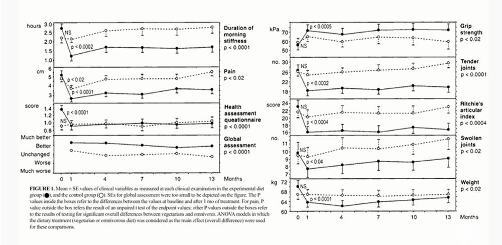 Man sieht deutlich, dass die 2. Gruppe (durchgezogene Linie in den Diagrammen) durch Ernährungsumstellung enorme Verbesserungen in jeder Kategorie zeigte. Ein wirklich sehr interessantes Ergebnis, dass uns allen zu denken geben sollte.