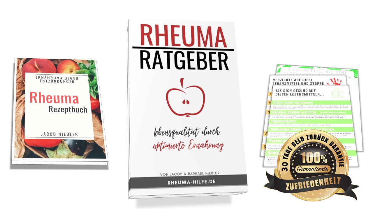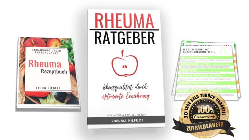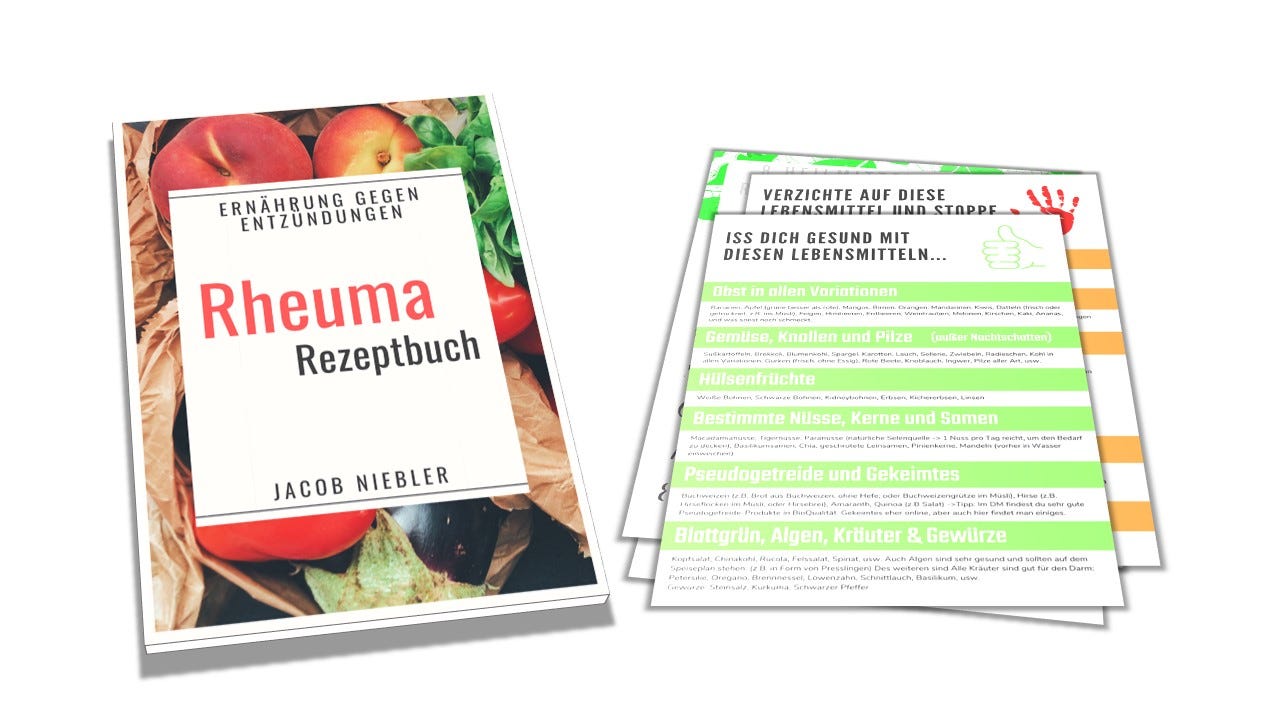 Sie bekommen unser Kochbuch "Das Rheuma-Rezeptbuch" mit über 40 einfachen, schnellen und leckeren Rezepten, sowie 4 praktische Infotafeln, die alle wichtigen Punkte nochmals übersichtlich darstellen. Somit machen Sie von Anfang an automatisch alles richtig, ohne sich selbst passende Rezepte suchen zu müssen, oder ständig nachschlagen zu müssen im Alltag.