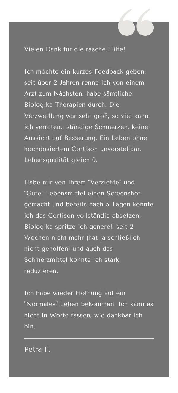 In diesem Zuge möchten wir auch Petra für ihr Vertrauen und ihre offene Art danken. Sie hatte großen Anteil daran, dass wir seitdem auch vielen anderen Betroffenen mit rheumatischen Beschwerden helfen konnten.